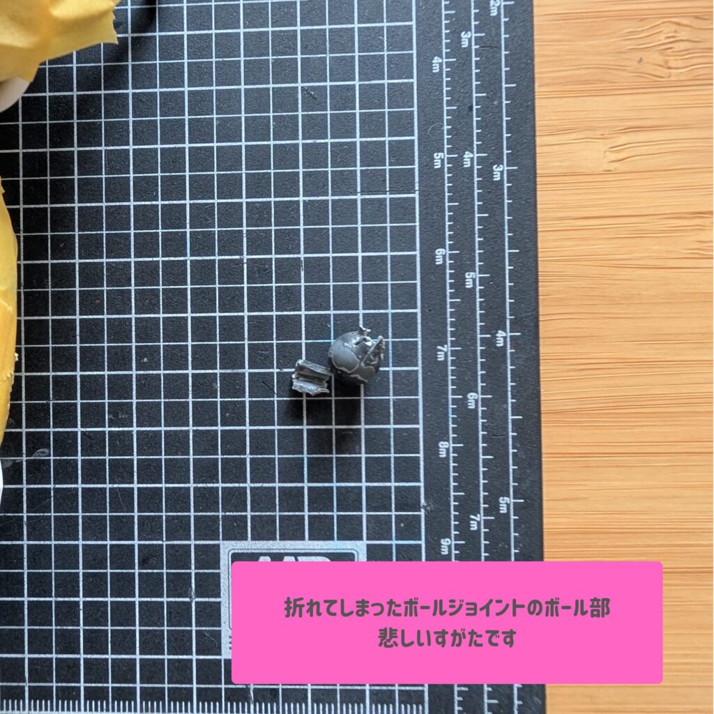 塗装もコーティングも終わった股関節のボールジョイントに対し、受け側である脚部パーツをはめ込もうとした際にメリッと折れました。