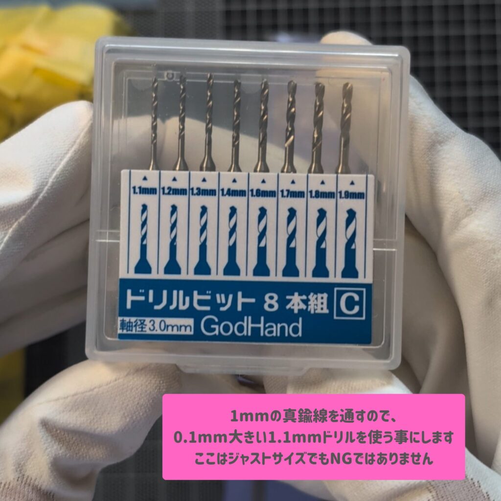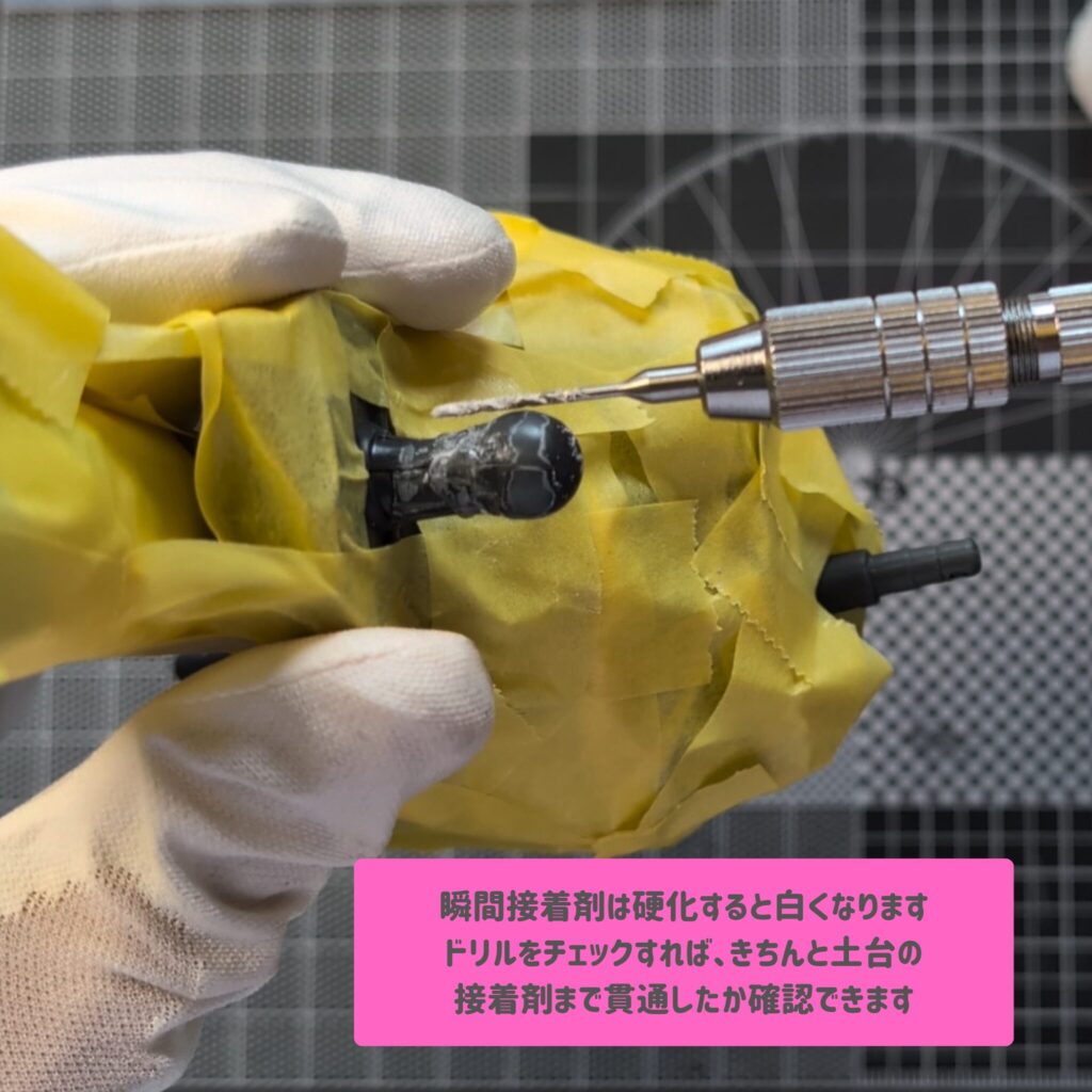 ドリルに通常のプラだけでなく瞬間接着剤の白いカスが付いていることを確認しましょう。