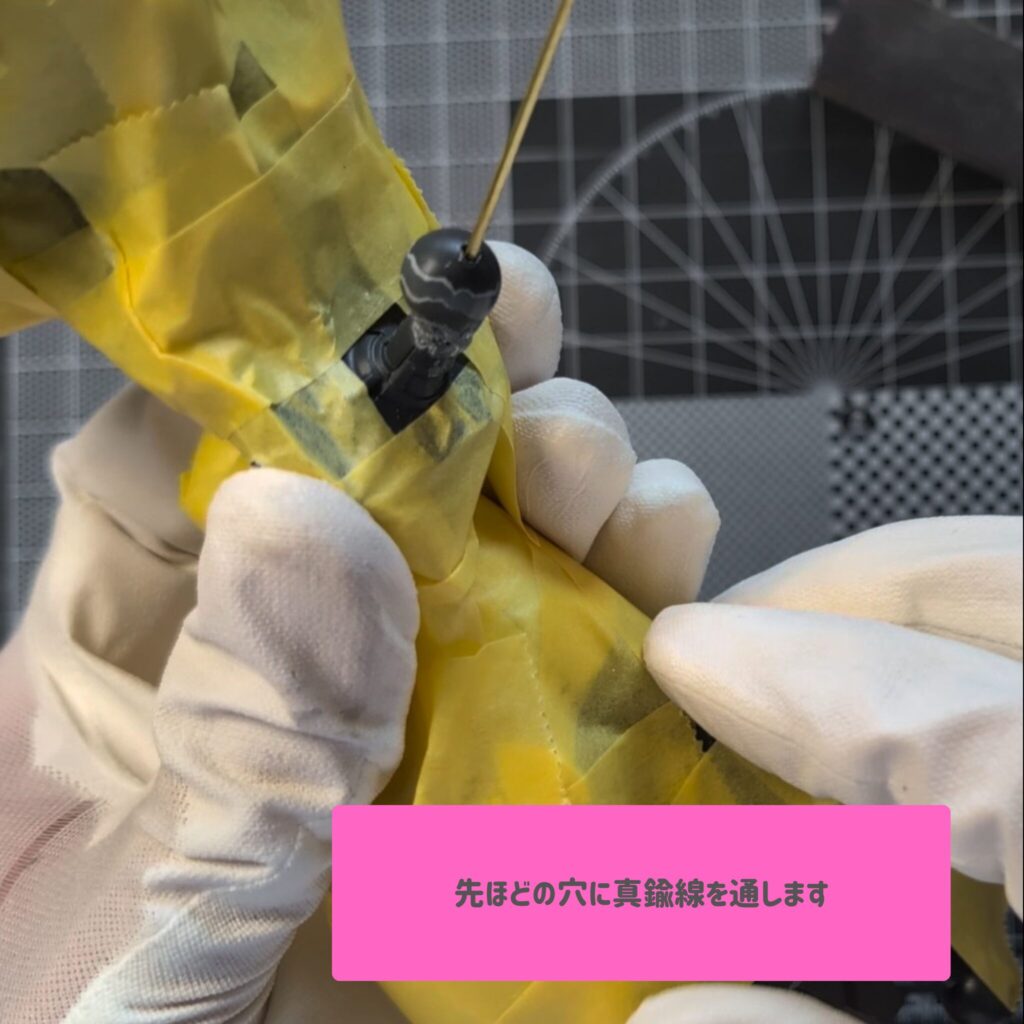 前記事でご紹介した通り、穴を開け、そこに真鍮線を通して接着します。