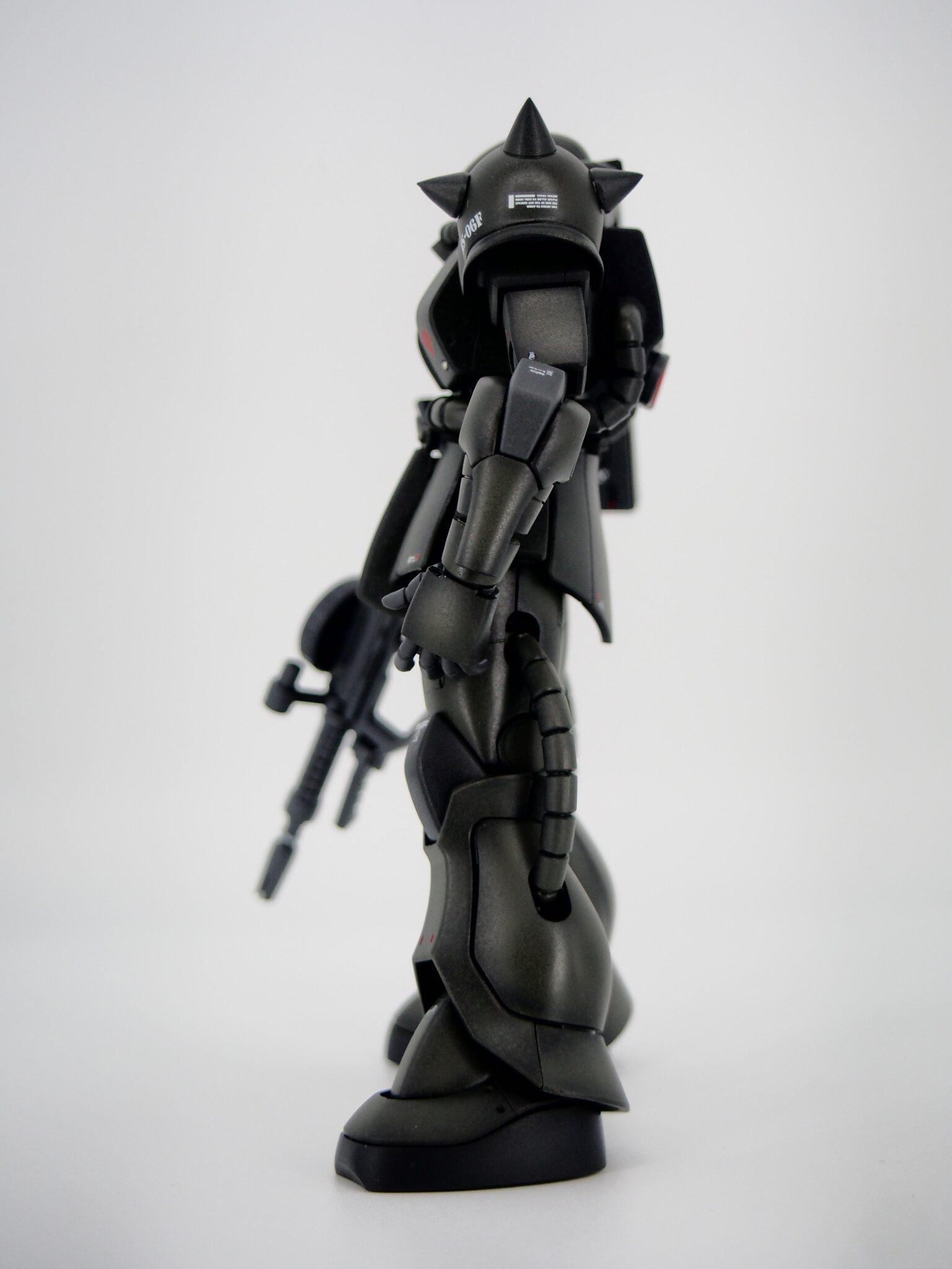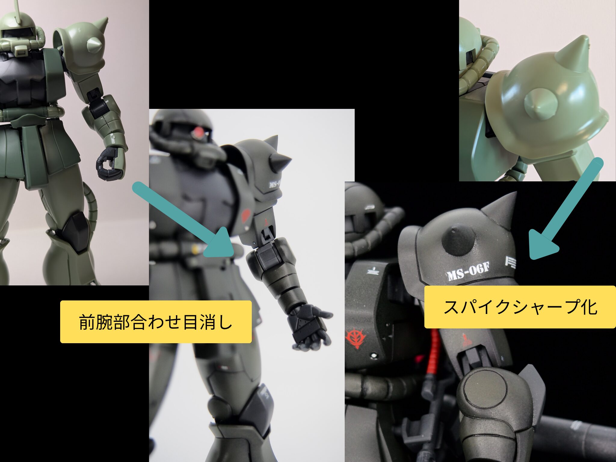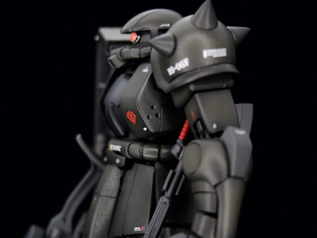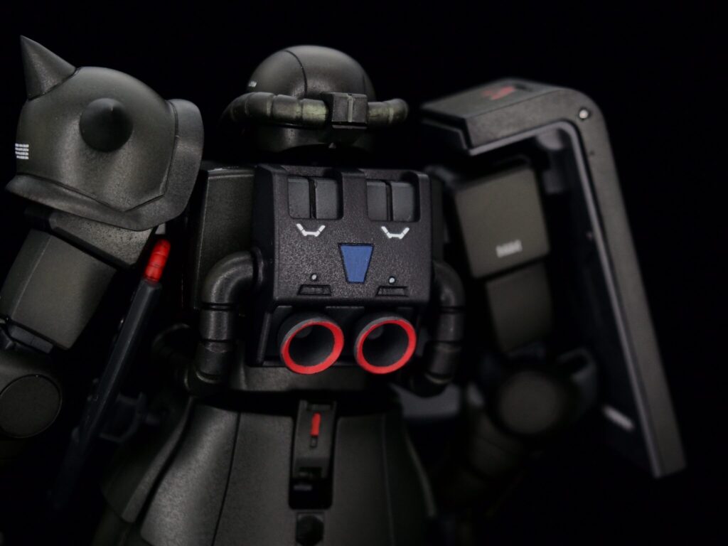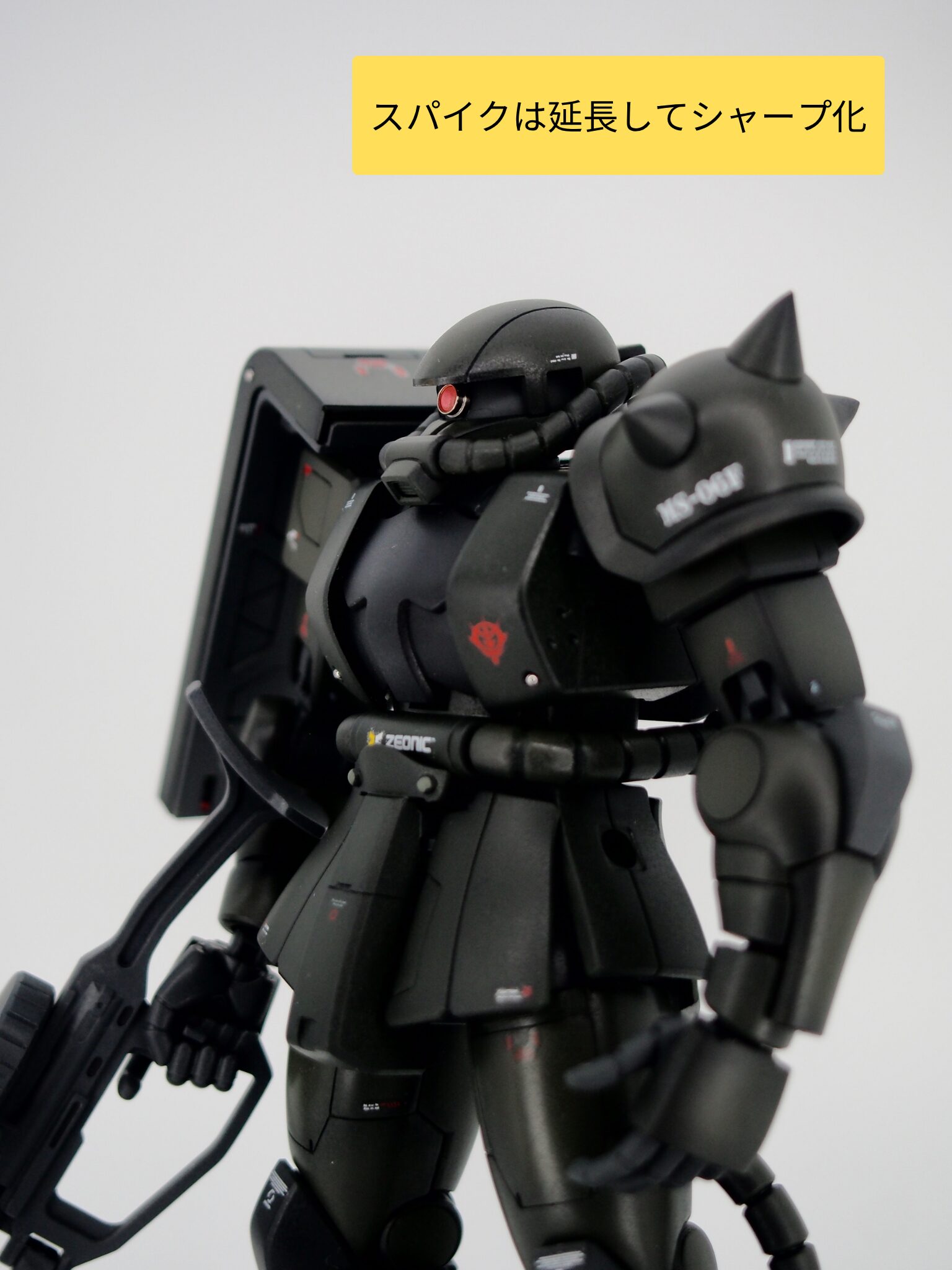 合わせ目消しはしっかり目に行い、ザクの顔ともいえるスパイクはしっかりとがらせました。