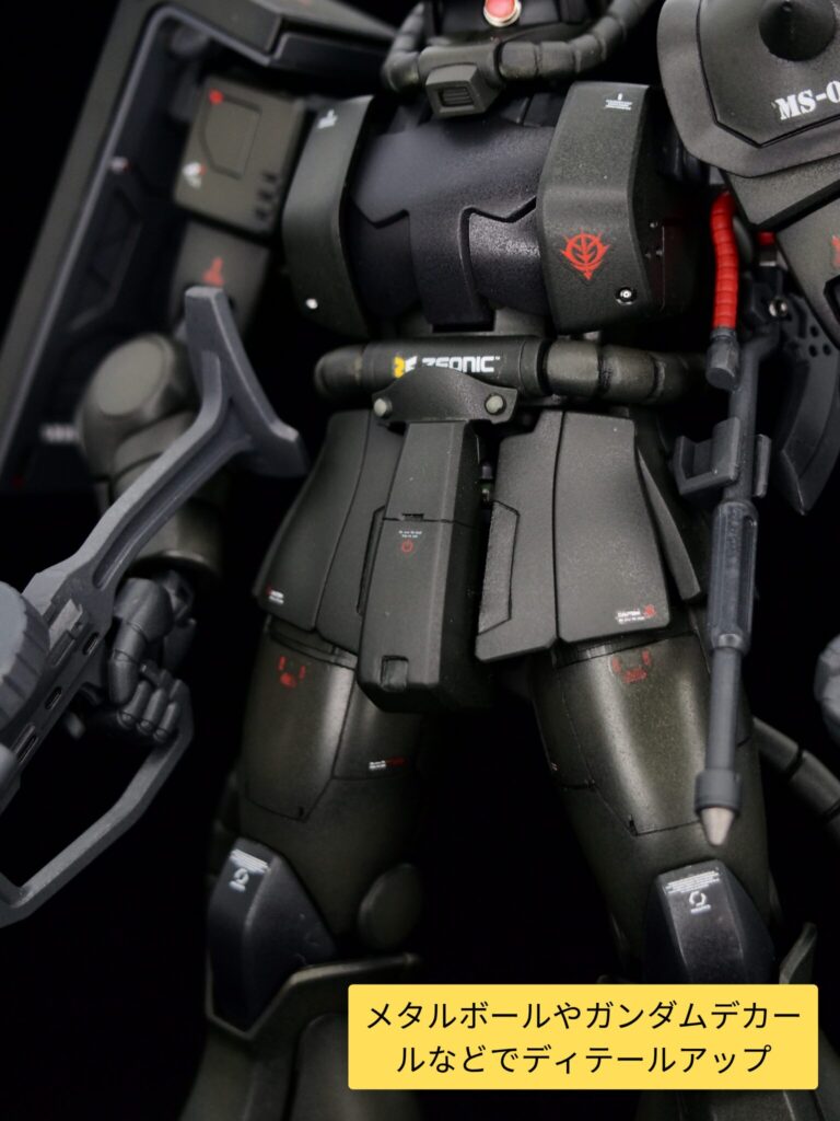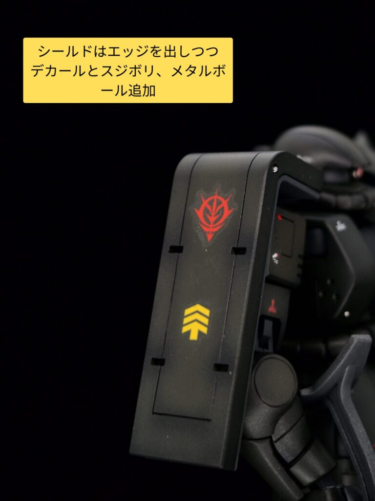 シールドはエッジ出しをしつつ、スジ彫りやメタルパーツ、デカールを追加しました。